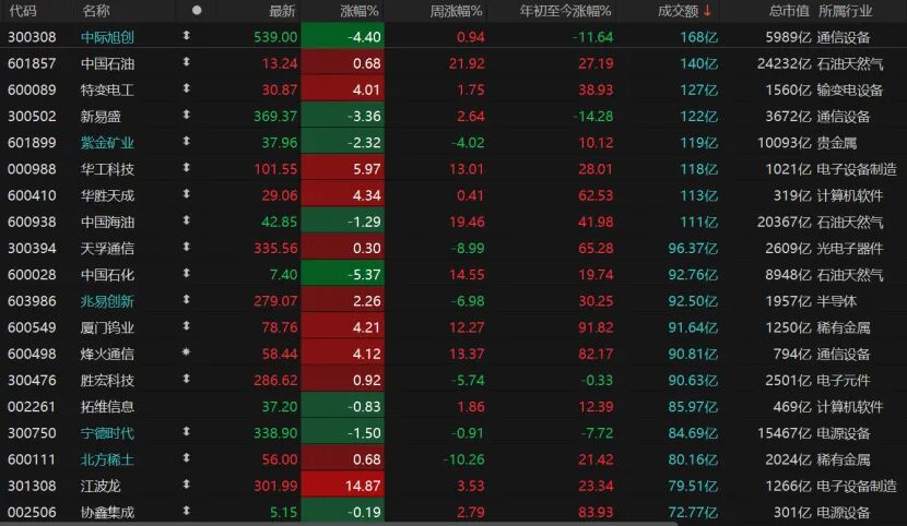 市场亏钱效应依旧,3640只个股收跌,跌停股21只;1745只个股收红,46只个股涨停。随着交易量能收缩,仅有8只个股日成交额超过100亿元,中际旭创、新易盛跌幅较大,特变电工、华胜天成涨幅均超过4%,华工科技涨近6%。