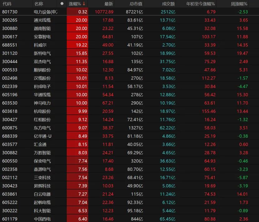 9只电力设备个股涨停,通光线缆、迦南智能、安靠智能“20cm”涨停,科威尔、新特电气、双杰电气均大涨,汉缆股份、积成电子、华通线缆、神马电力等均涨停。