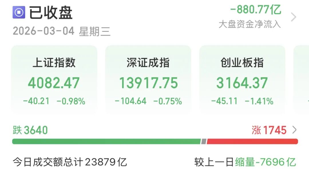 3月4日,A股全天低迷,成交额较前一交易日减少近7700亿元,指数、板块及个股跌多涨少,市场整体呈现亏钱效应。军工股逆市上涨,交通运输、石油石化、非银金融等板块跌幅居前。