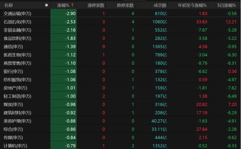 交通运输、石油石化、非银金融板块跌幅均超过2%,食品饮料、通信、医药生物、商贸零售、银行、纺织服饰、房地产等板块也跌幅靠前。