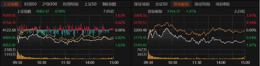 指数表现上,沪指收跌0.98%报4082.47点,创业板指收跌1.41%报3164.37点,深证成指收跌0.75%。北证50、科创50微跌,沪深300、上证50跌幅均超过1%。