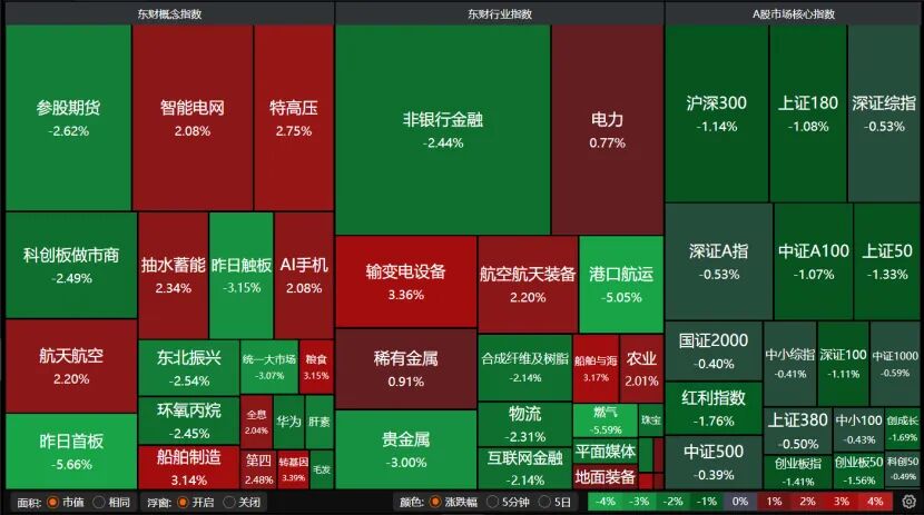 盘面上,非银金融、贵金属、港口航运、物流等板块跌幅靠前,智能电网、特高压、航天航空、船舶制造、输变电设备等板块表现不错。
