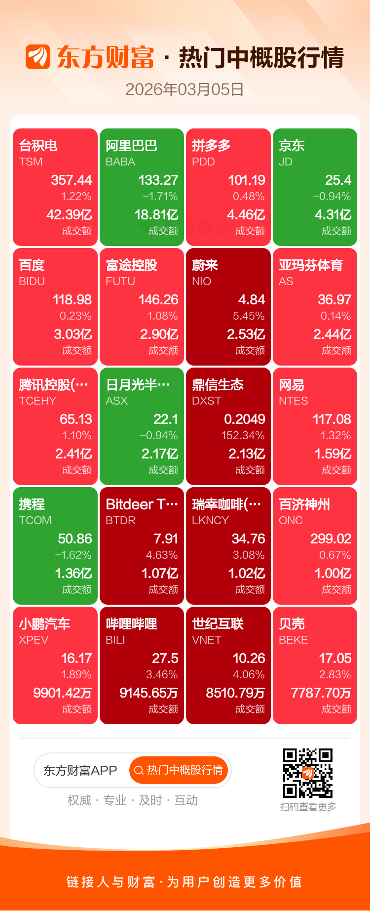 台积电涨1.22%,阿里巴巴跌1.71%,拼多多涨0.48%,京东跌0.94%,百度涨0.23%,富途控股涨1.08%,蔚来涨5.45%,亚玛芬体育涨0.14%,腾讯控股(ADR)涨1.10%,日月光半导体跌0.94%。