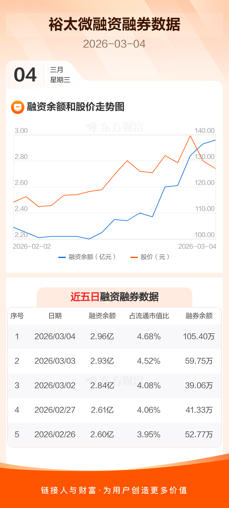 交易所最新数据显示,裕太微于2026年3月4日获融资买入3165.66万元,融资偿还2827.90万元,当日融资净买入337.76万元。目前,该股融资余额2.96亿,占流通市值比例为4.68%。