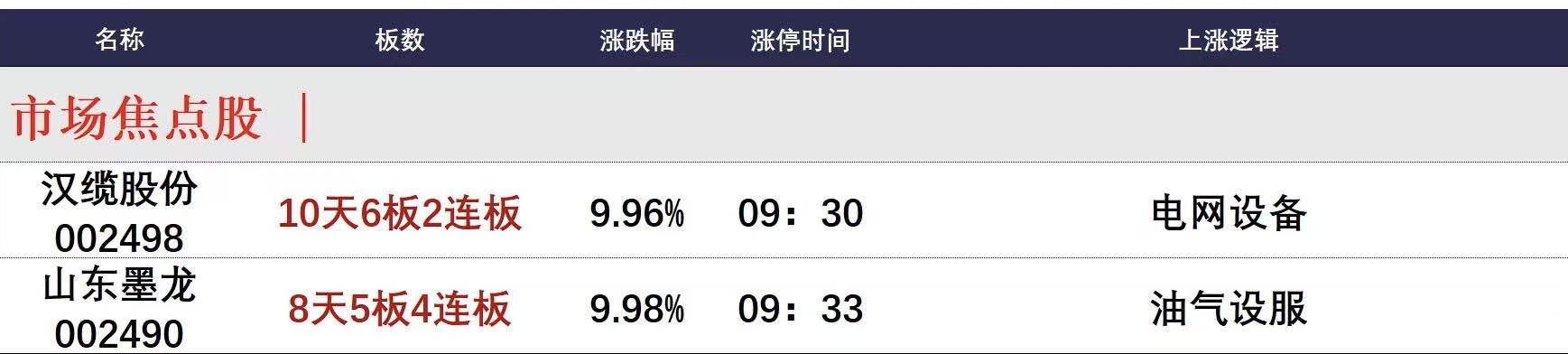 今日午盘全市场共61股涨停,连板股总数8只,18股封板未遂,封板率为77%(不含ST股、退市股)。焦点股方面,油气股山东墨龙8天5板,电网设备板块汉缆股份10天6板。