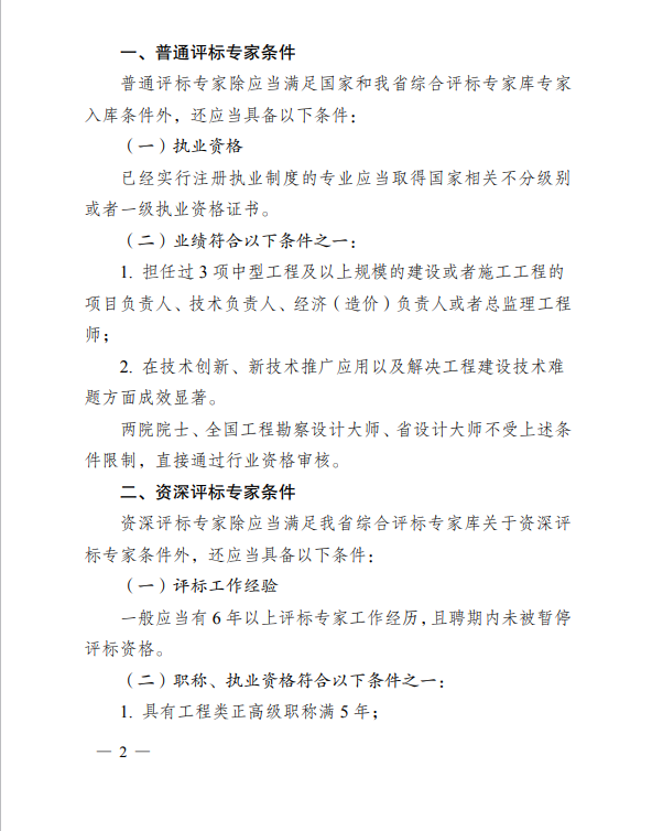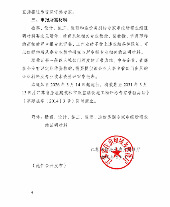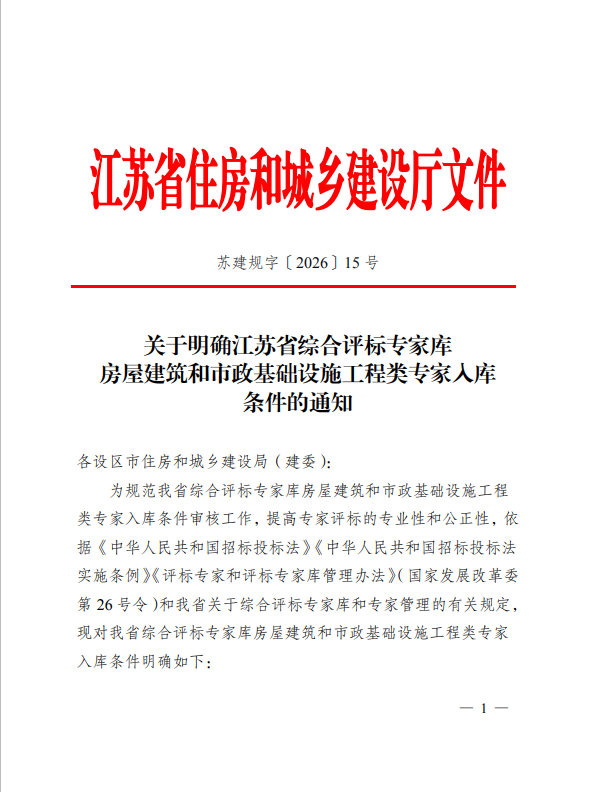近日,江苏省住房和城乡建设厅正式印发《关于明确江苏省综合评标专家库房屋建筑和市政基础设施工程类专家入库条件的通知》(苏建规字〔2026〕15号),严格明确了房屋建筑和市政基础设施工程类评标专家的入库新要求。