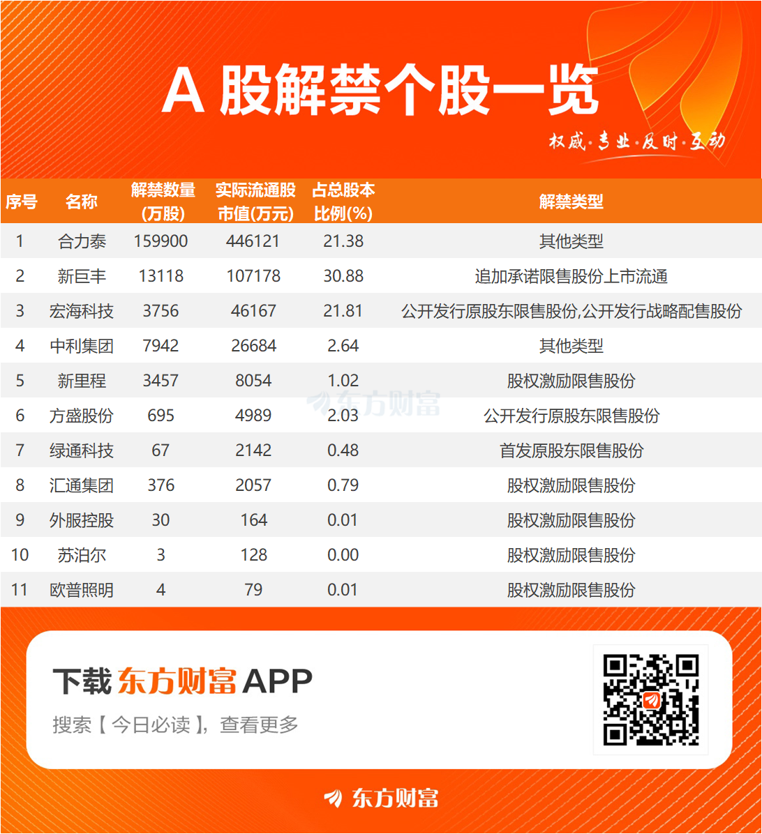 【明日解禁】明日11股解禁 合力泰、新巨丰解禁市值居前