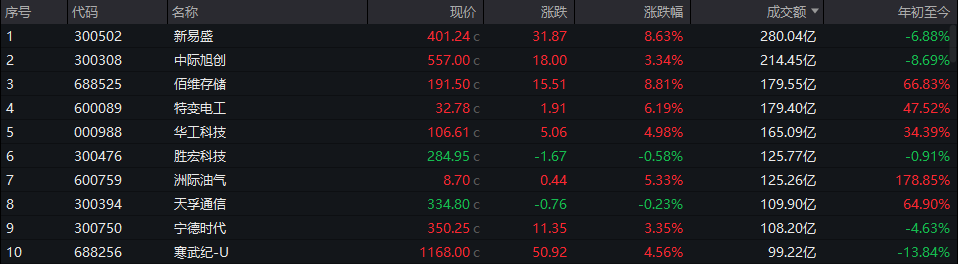 个股方面,新易盛全天成交额超280亿元位居沪深两市第一,中际旭创、佰维存储、特变电工等成交额靠前。