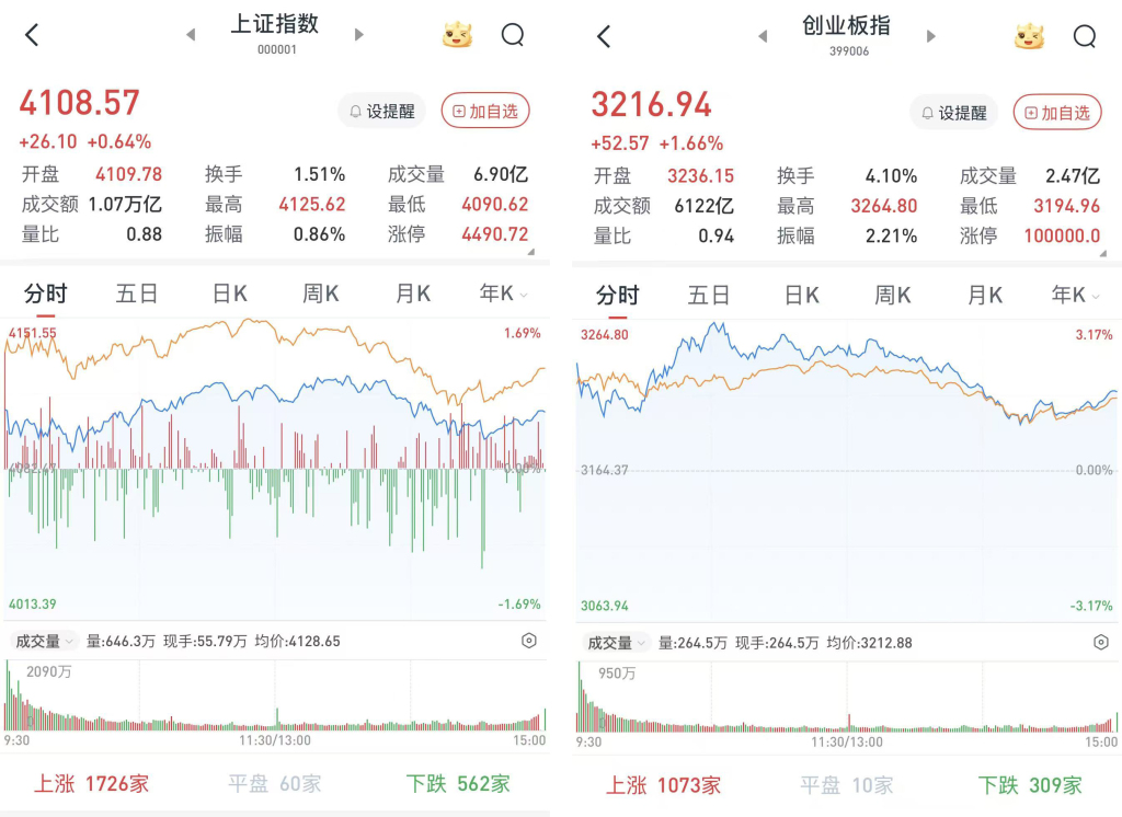 至收盘,上证综指涨0.64%,报4108.57点;科创50指数涨1.72%,报1405.35点;深证成指涨1.23%,报14088.84点;创业板指涨1.66%,报3216.94点。