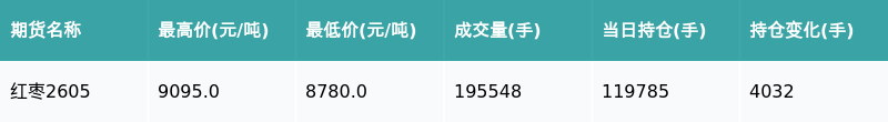 南财智讯3月5日电,盘后期货数据显示,郑州商品交易所的红枣主力合约收涨1.87%,收盘报8980.0元/吨,日内资金流入5029.68万元。其他相关指标见下表: