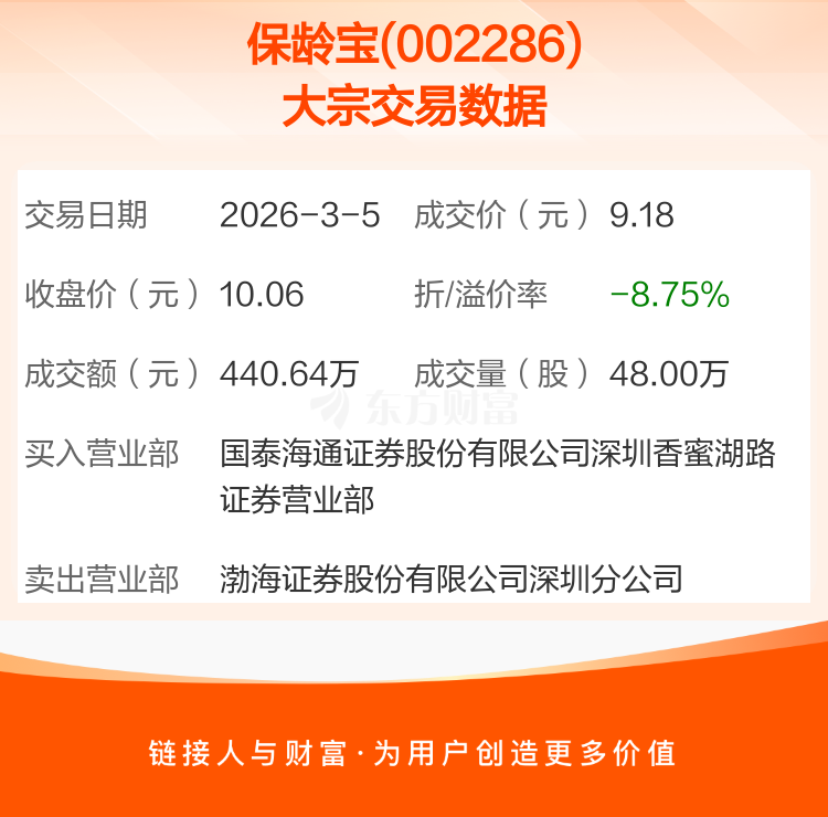 大宗交易:保龄宝成交440.64万元,折价8.75%(3-5)