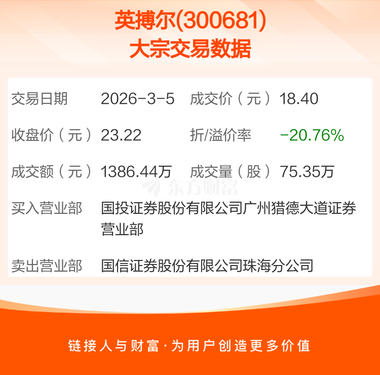 2026年3月5日,英搏尔发生1笔大宗交易,共成交75.35万股,成交金额1386.44万元,占其流通市值比例为0.26%。