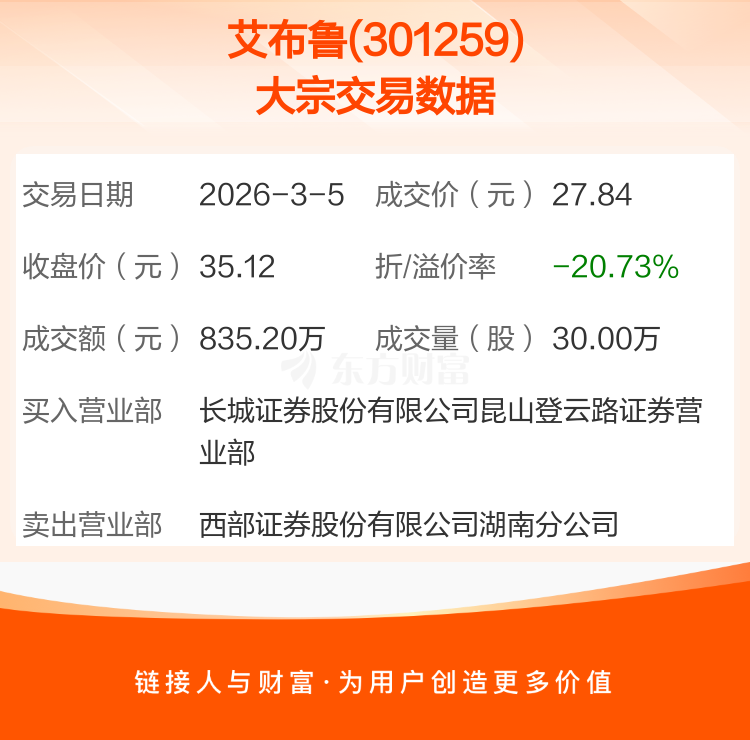大宗交易:艾布鲁成交835.20万元,折价20.73%(3-5)