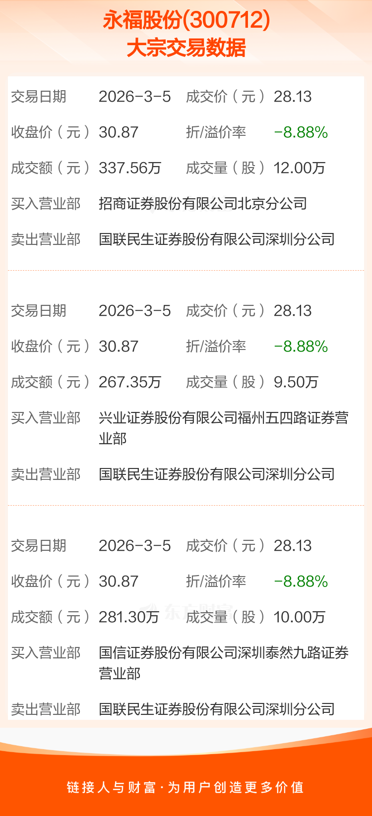 2026年3月5日,永福股份发生3笔大宗交易,共成交31.50万股,成交金额886.21万元,占其流通市值比例为0.15%。