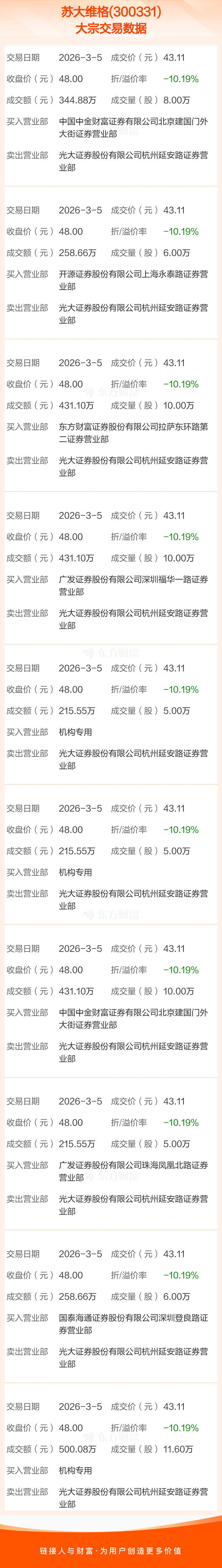 2026年3月5日,苏大维格发生10笔大宗交易,共成交76.60万股,成交金额3302.23万元,占其流通市值比例为0.33%。