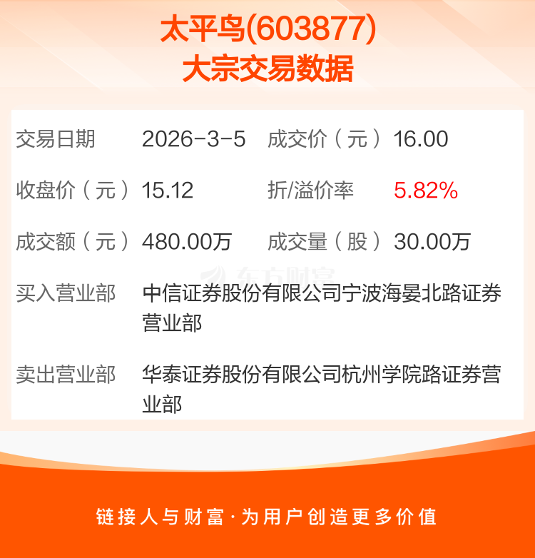 2026年3月5日,太平鸟发生1笔大宗交易,共成交30.00万股,成交金额480.00万元,占其流通市值比例为0.07%。