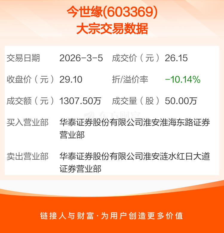 2026年3月5日,今世缘发生1笔大宗交易,共成交50.00万股,成交金额1307.50万元,占其流通市值比例为0.04%。