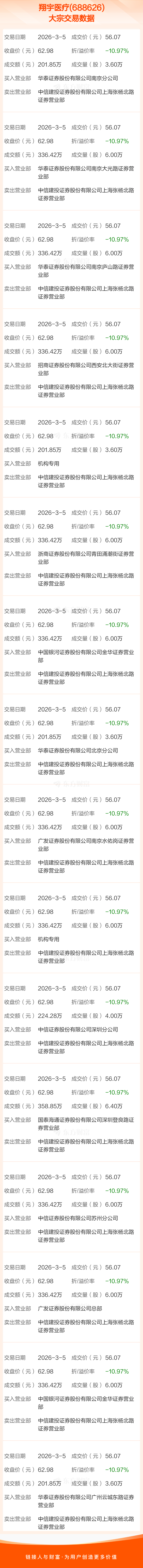 大宗交易:翔宇医疗成交4754.73万元,折价10.97%(3-5)