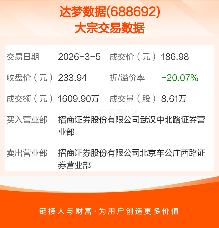 2026年3月5日,达梦数据发生1笔大宗交易,共成交8.61万股,成交金额1609.90万元,占其流通市值比例为0.09%。