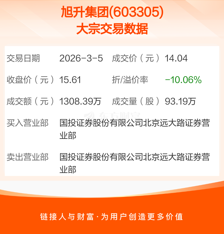 2026年3月5日,旭升集团发生1笔大宗交易,共成交93.19万股,成交金额1308.39万元,占其流通市值比例为0.07%。