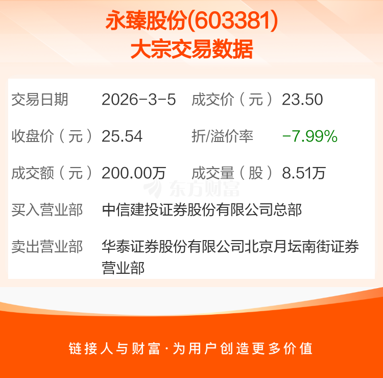 大宗交易:永臻股份成交200.00万元,折价7.99%(3-5)