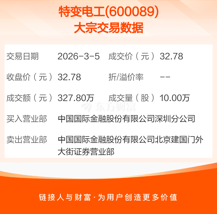 2026年3月5日,特变电工发生1笔大宗交易,共成交10.00万股,成交金额327.80万元。