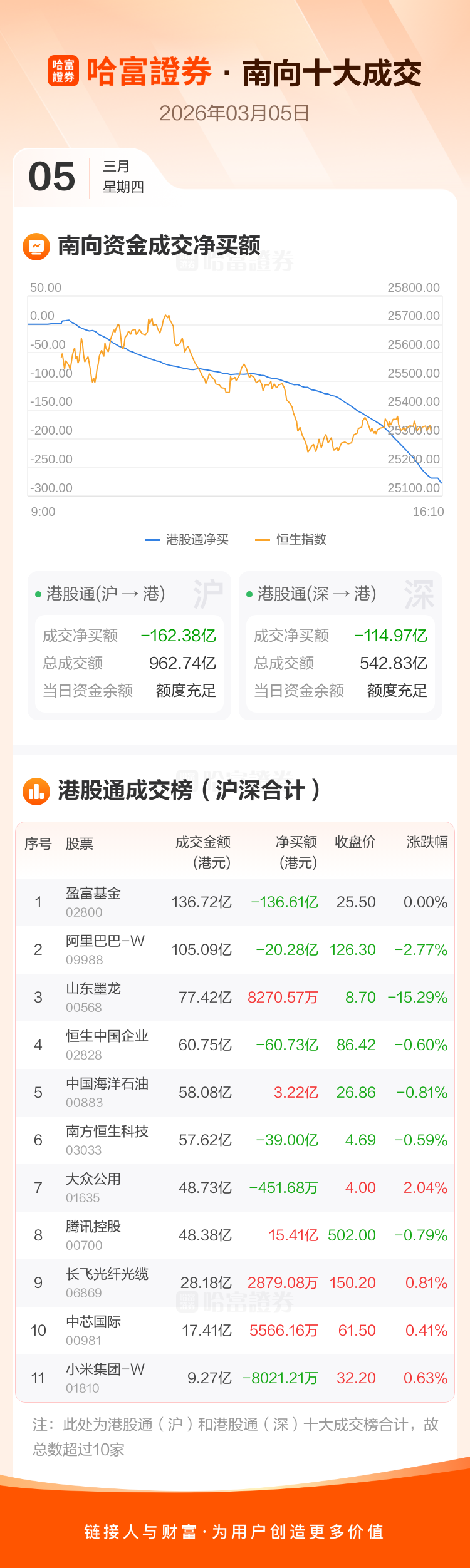 南向十大成交股中,腾讯控股、中国海洋石油、山东墨龙分别获净买入15.41亿港元、3.22亿港元、8270.57万港元。盈富基金、恒生中国企业、南方恒生科技分别遭净卖出136.61亿港元、60.73亿港元、39.00亿港元。