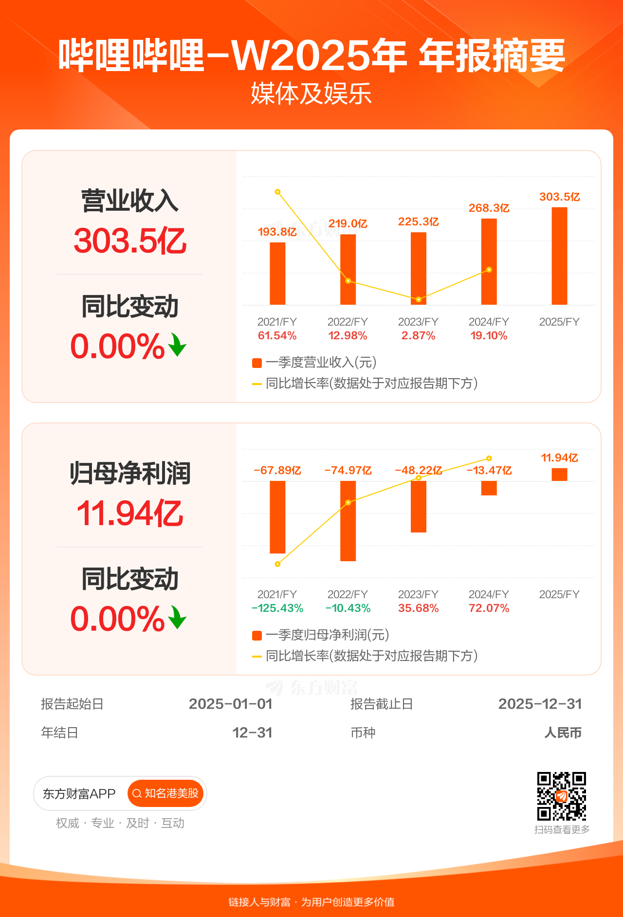 哔哩哔哩-W3月5日发布年报业绩,截至2025年12月31日的12个月内,该公司营业收入303.48亿人民币,同比增长13.10%;公司权益持有人应占溢利(归母净利润)11.94亿人民币,同比增长188.62%,低于机构一致预测的19.17亿人民币。
