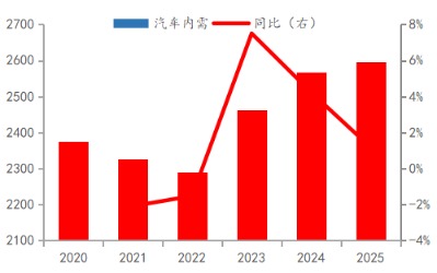 根据中汽协数据统计,2025年中国汽车产量3453.1万辆,累计同比增加10.4%。其中新能源车(纯电+混动)累计产量1662.6万辆,累计同比增长38.4%。按照海关数据统计,2025年中国出口936.2万辆,按照中汽协数据统计累计出口量709.7万辆,根据商务部不定期消息公布,2025年二手车出口量预计50-60万辆,如此推算海关数据与中汽协统计出口数据剩余差值约175万辆,包含已通关尚未装船出口和低速车等。取中值推算其中90万辆为已通关尚未装船汽车,即2025年中国境内汽车供给为2656.8万辆,按照同样方法推算2024年中国境内供给量为2516万辆,即2025年境内汽车供给增量为141万辆,同比增长5.6%。