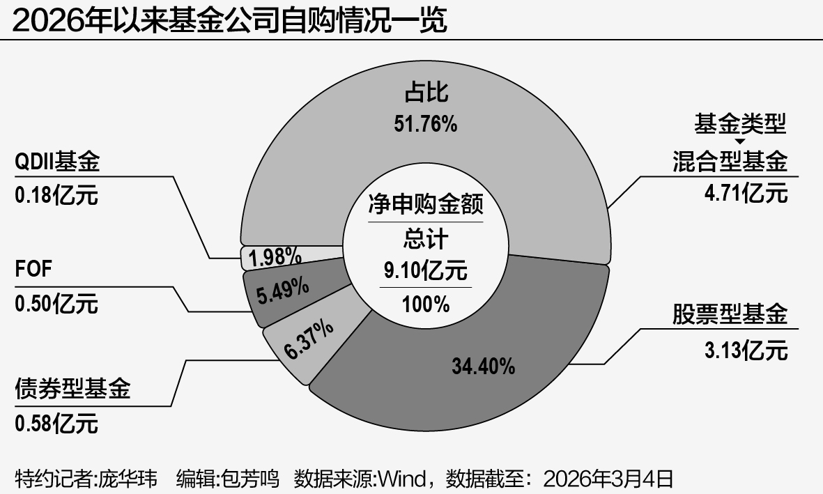 Wind数据显示,截至3月4日,2026年以来已有42家基金公司启动了自购,合计掏出9.1亿元“真金白银”。