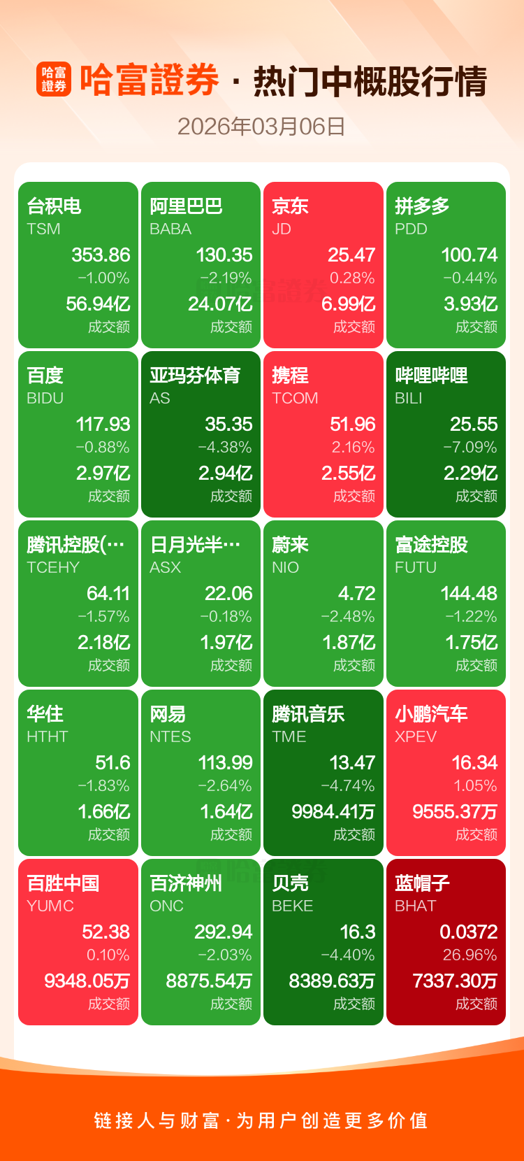 台积电跌1.00%,阿里巴巴跌2.19%,京东涨0.28%,拼多多跌0.44%,百度跌0.88%,亚玛芬体育跌4.38%,携程涨2.16%,哔哩哔哩跌7.09%,腾讯控股(ADR)跌1.57%,日月光半导体跌0.18%。