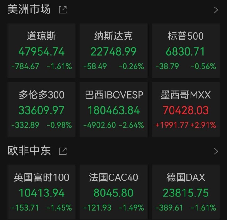 美股三大指数全线下跌。截至收盘,道琼斯工业指数跌1.61%,跌超780点,纳斯达克指数跌0.26%,标普500指数跌0.56%。