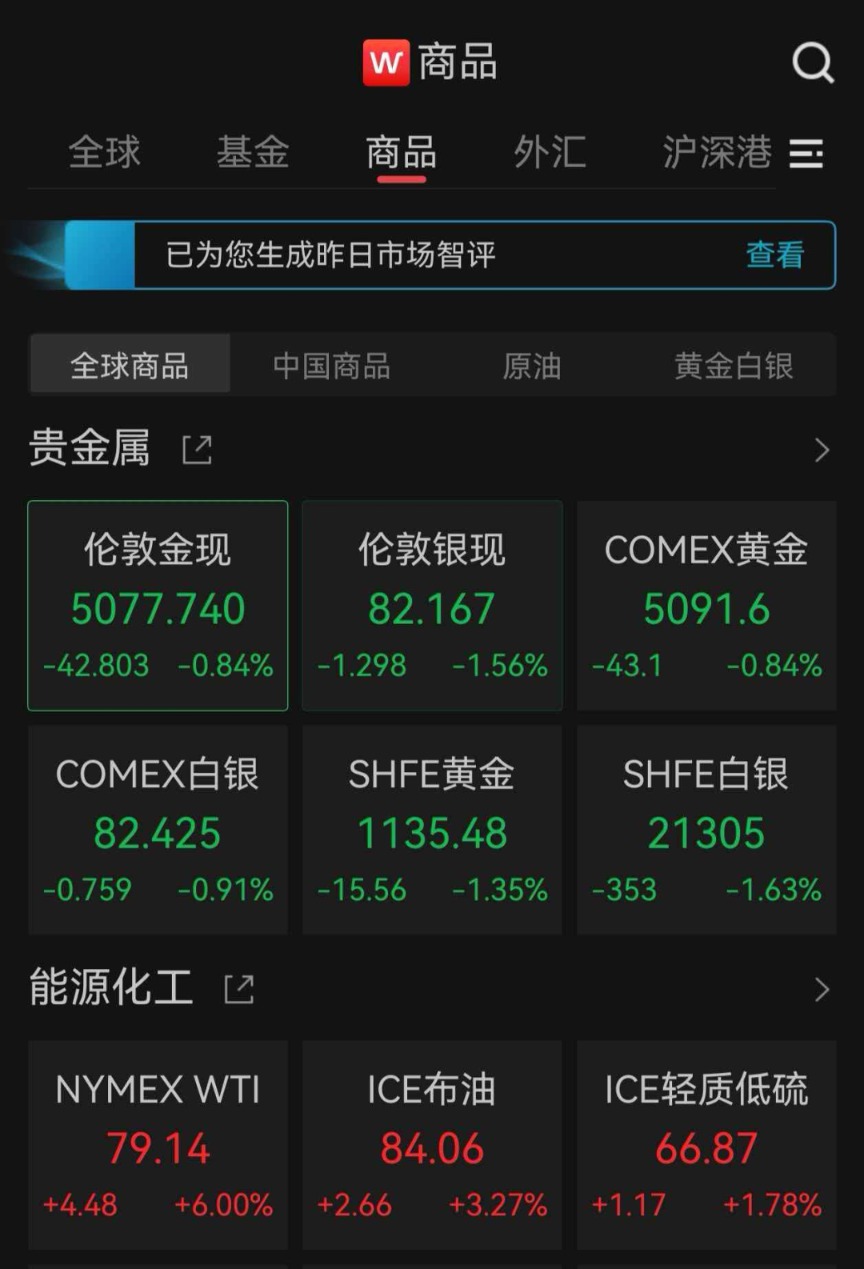 贵金属方面,截至北京时间3月6日5:50,伦敦现货黄金报5077.74美元/盎司,跌0.84%;COMEX黄金期货报5091.6美元/盎司,跌0.84%。伦敦现货白银跌1.56%;COMEX白银期货跌近1%。