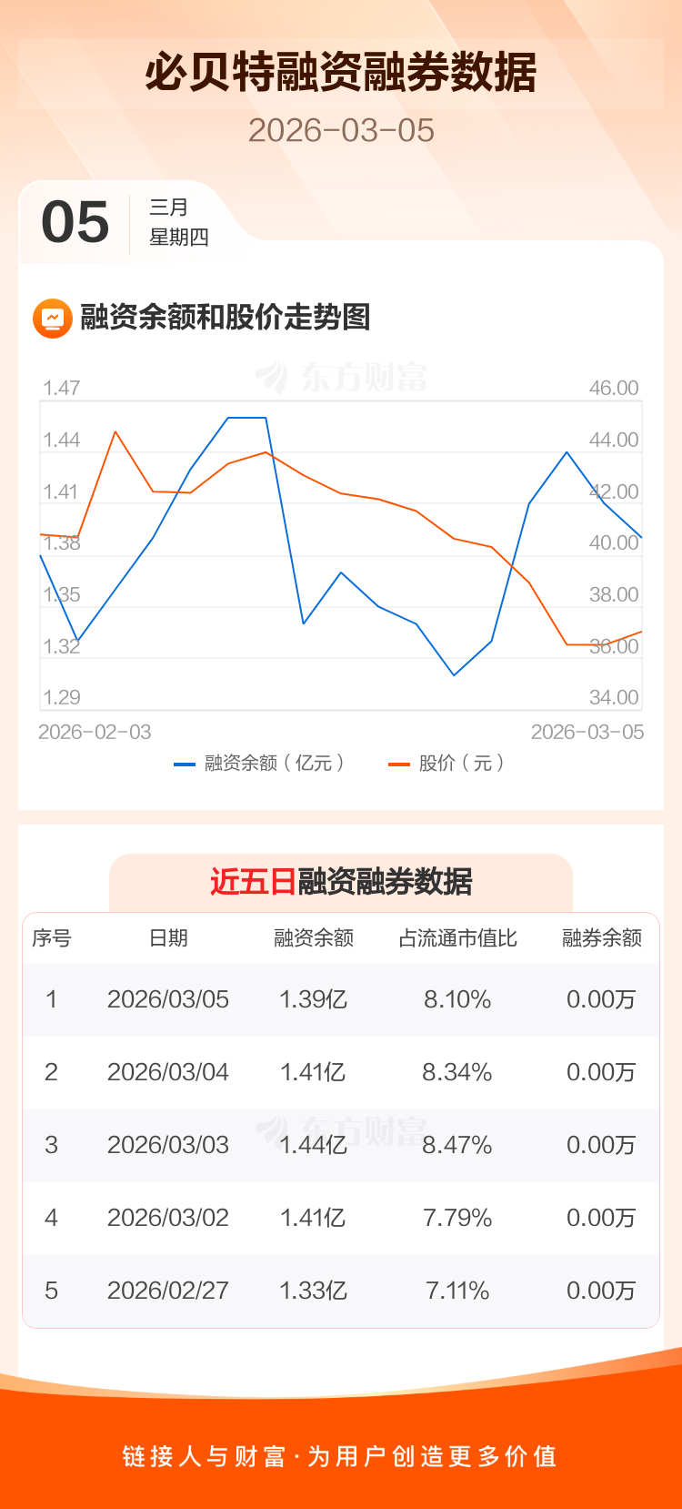 交易所最新数据显示,必贝特于2026年3月5日获融资买入314.26万元,融资偿还523.40万元,当日融资净偿还209.15万元。目前,该股融资余额1.39亿,占流通市值比例为8.10%。