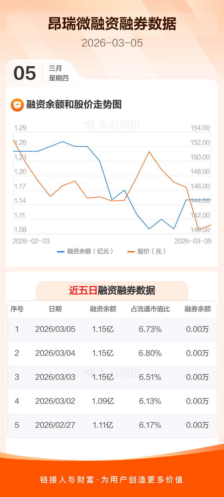 交易所最新数据显示,昂瑞微于2026年3月5日获融资买入619.50万元,融资偿还672.46万元,当日融资净偿还52.97万元。目前,该股融资余额1.15亿,占流通市值比例为6.73%。