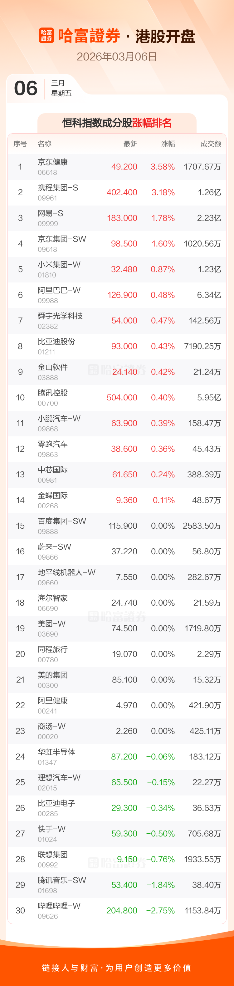 港股3月6日高开,恒生指数开盘报25358.56点,涨37.22点,涨幅0.15%;恒生科技指数开盘报4818.81点,涨22.48点,涨幅0.47%。恒生指数成分股中京东物流、京东健康、携程集团-S涨幅居前,港铁公司、紫金矿业、石药集团跌幅靠前。恒生科技指数成分股中京东健康、携程集团-S、网易-S涨幅居前,哔哩哔哩-W、腾讯音乐-SW、联想集团跌幅靠前。