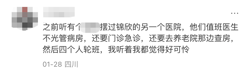 其二为岗位工作强度与职责边界问题。有网友在评论区转述了其了解到的、锦欣旗下其他医疗机构的从业经历,称该机构值班医生需同时承担病房管理、门诊急诊、对应养老院查房等多项工作,仅4人轮值,工作负荷较大。