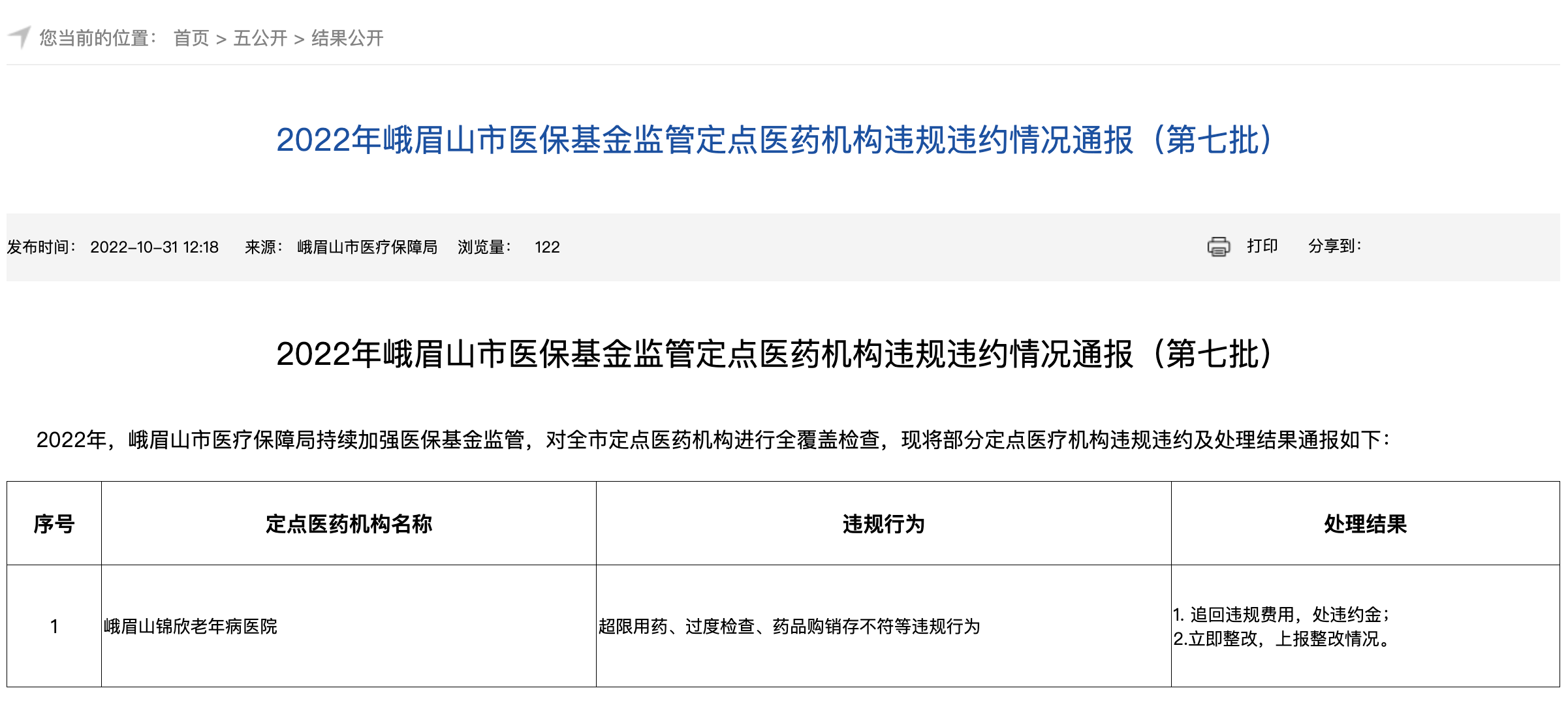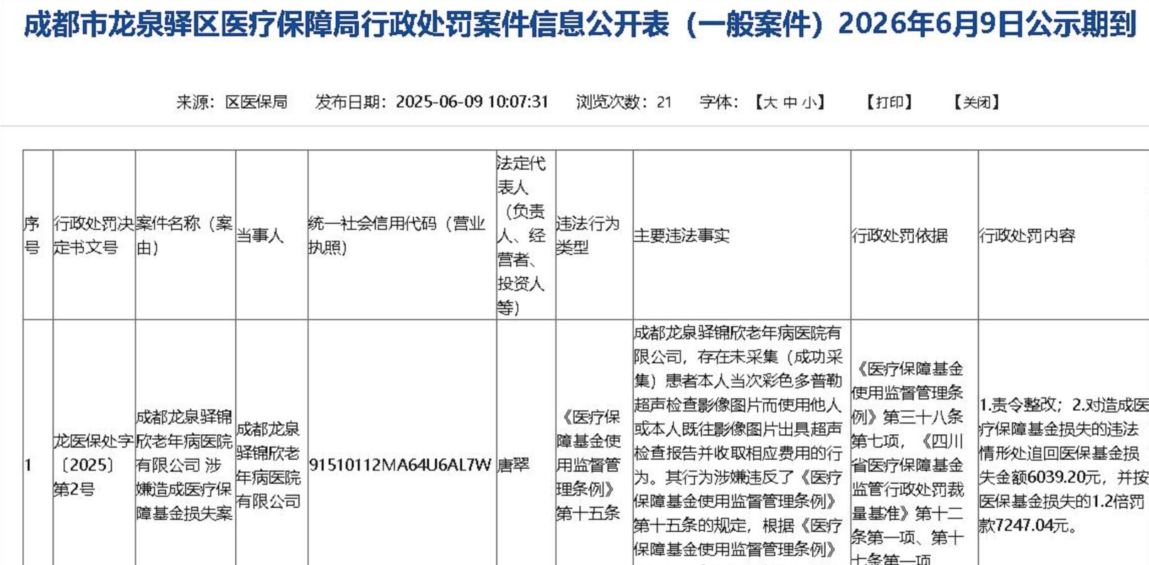 其中,峨眉山锦欣老年病医院2022年因“超限用药、过度检查”被当地医保部门通报,2023年7月与11月,又先后因“多计费、重复收费、超标准收费”等行为,被责令退回违规费用,并被追缴一倍违约金;成都龙泉驿锦欣老年病医院在2024年2月至2025年3月期间,因“重复收费、串换项目”等违规问题,涉及违规使用医保基金72.4万元,被当地医保部门处罚。