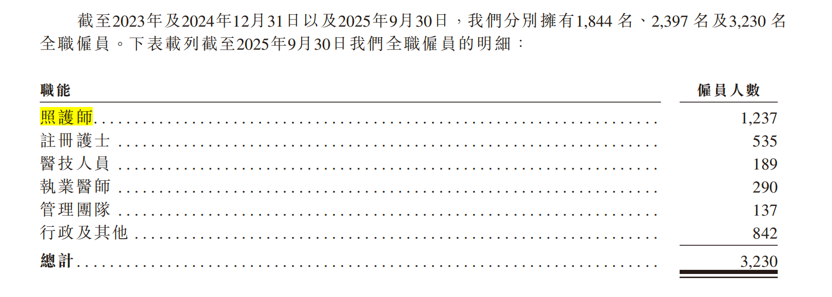 从招股书披露的人员配置情况来看,其一线照护力量与上述行业标准的匹配度,成为市场关注的核心问题。截至2025年9月30日,在全集团3230名全职员工中,包含医师201人、护士719人、照护师1237人,其余为行政、销售等后勤人员。