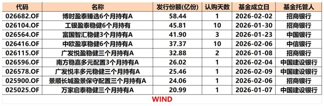 2026年以来,多只FOF首募表现强劲,成为市场瞩目的“小爆款”。比如,博时盈泰臻选6个月持有期混合FOF发行规模为58.44亿元,认购仅1天;工银盈泰稳健6个月持有混合FOF发行规模为45.81亿元。富国智汇稳健3个月持有期混合FOF募集规模也在40亿元以上,达到41.9亿元。此外,南方稳嘉多元配置3个月持有FOF、景顺长城盈景保守配置三个月持有混合FOF等募集规模均超20亿元。
