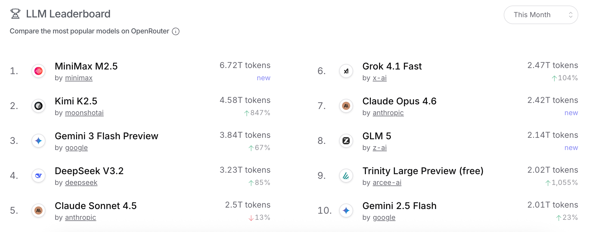 全球最大的AI模型API聚合平台OpenRouter数据显示,自3月以来的大模型调用量排行榜中,MiniMax M2.5和Kimi K2.5分列第一、第二,排在其后的是谷歌Gemini 3 Flash Preview、DeepSeek V3.2、Claude Sonnet 4.5等模型。前十大模型累计调用量达到31.29万亿tokens,其中MiniMax M2.5调用量为6.42万亿tokens,约占总量的五分之一。