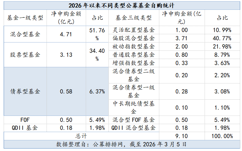 3月5日,公募排排网数据显示,截至当日,今年以来共有42家公募机构自购旗下基金77次,合计自购金额达9.1亿元。