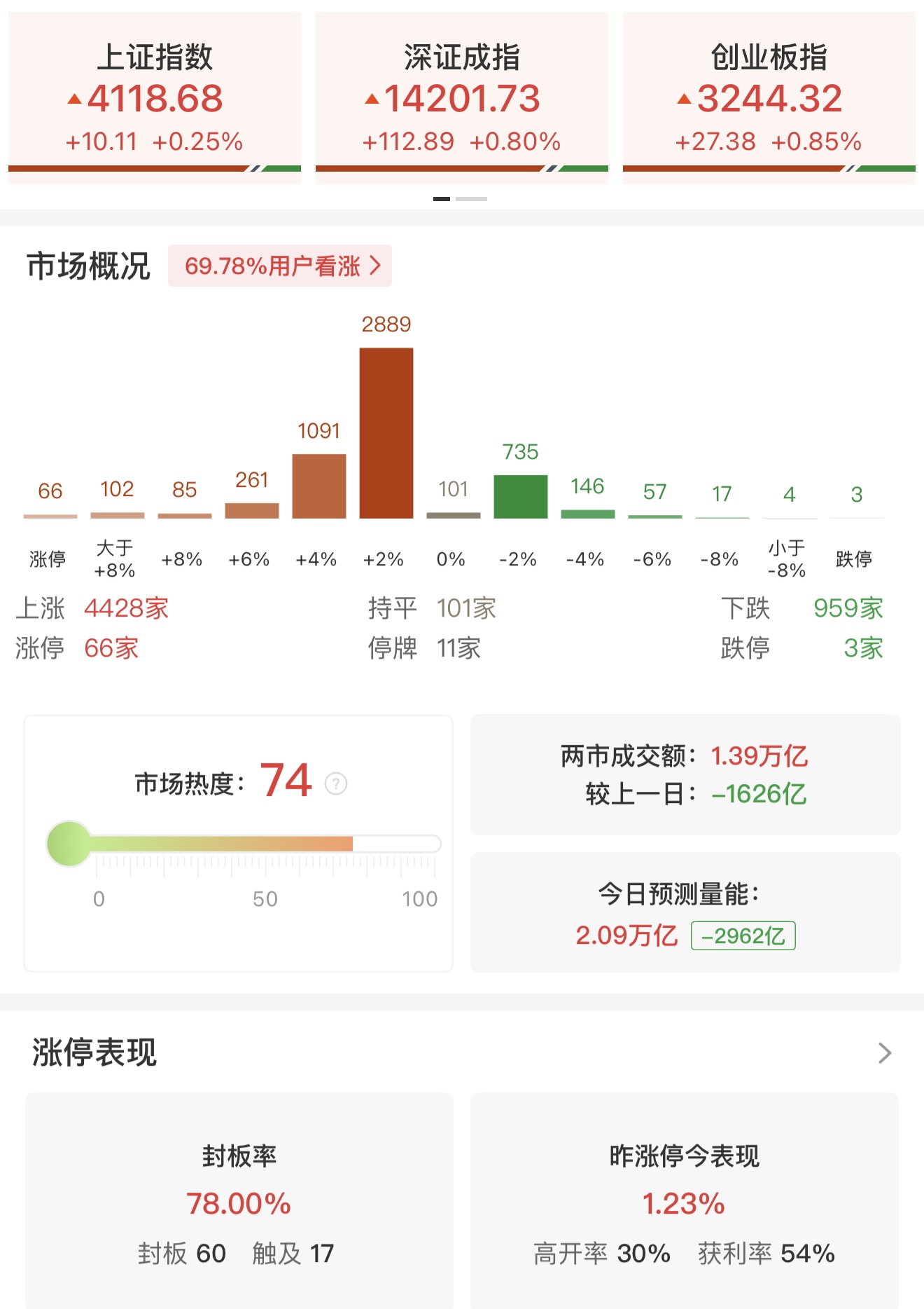 财联社3月6日电,市场早盘震荡回升,三大指数低开高走集体翻红,黄白线明显分化。沪深两市半日成交额1.39万亿,较上个交易日缩量1626亿。盘面上热点快速轮动,全市场超4400只个股上涨。从板块来看,电网设备概念爆发,顺钠股份、汉缆股份双双3连板,中恒电气、中国能建、广电电气涨停。发电机概念快速走强,苏常柴A、常宝股份涨停。化工板块表现活跃,金正大、金浦钛业、红宝丽、红墙股份涨停。CPO概念震荡回升,联特科技20cm涨停创历史新高。下跌方面,油气股表现疲软,石化油服、中曼石油大跌。截至收盘,沪指涨0.25%,深成指涨0.8%,创业板指涨0.85%。