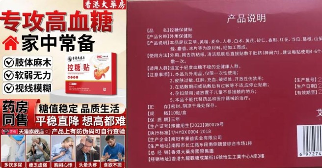 一款产品包装上“保健”二字印成浅灰色、几乎肉眼不可见的“控糖保健贴”,正以“专攻高血糖、平稳直降”的名义在电商平台销售。它们打着“香港大药房”的旗号,生产地却在河南南阳,与香港毫无关系。