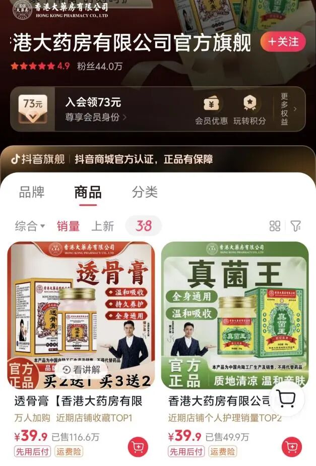 仅在抖音香港大药房有限公司官方旗舰店内,单是“透骨膏”一款产品显示已售116.6万单,以单价39.9元计算,销售额高达4628万元。一二十万的罚款在巨大的收益面前明显微不足道。
