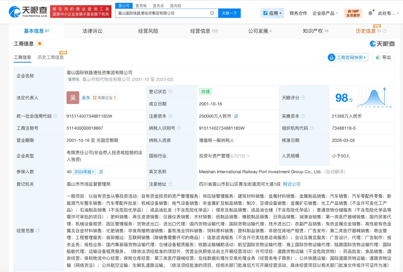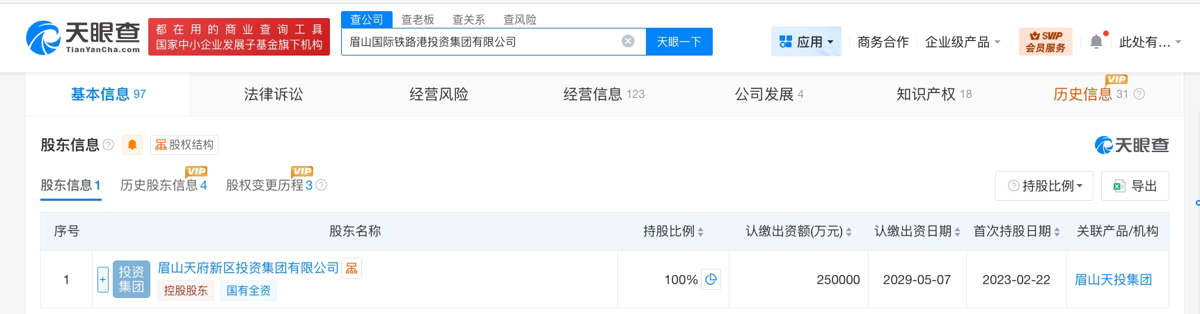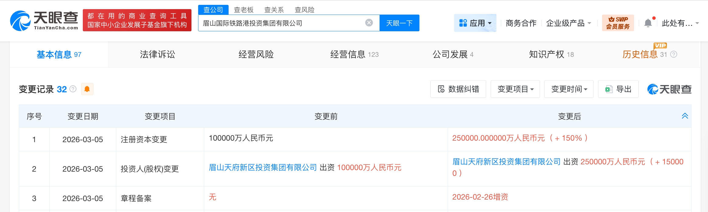 眉山国际铁路港投资集团增资至25亿元 增幅150%