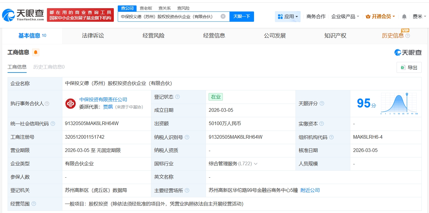 南方财经3月6日电,天眼查工商信息显示,近日,中保投义德(苏州)股权投资合伙企业(有限合伙)成立,执行事务合伙人为中保投资有限责任公司,出资额5.01亿人民币,经营范围为股权投资,由中汇人寿保险股份有限公司、中保投资有限责任公司共同出资。