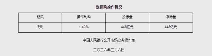 中新网3月6日电据央行网站消息,2026年3月6日中国人民银行以固定利率、数量招标方式开展了448亿元7天期逆回购操作。具体情况如下: