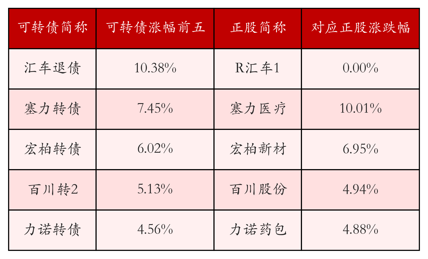 南财智讯3月6日电,盘后数据显示,债市方面,中证转债指数收涨0.26%,报514.32,成交额为662.53亿元。可转债方面,今日共成交364只可转债,其中264只收涨,1只收平,99只收跌。具体来看,27只可转债涨幅超过2%。其中汇车退债(404004)涨10.38%,塞力转债(113601)涨7.45%,宏柏转债(111019)涨6.02%。今日有13只可转债跌幅超2%,东时转债(113575)跌18.96%,大中转债(127070)跌8.32%,福新转债(111012)跌6.79%。存在交易量的可转债所对应的正股中,284只收涨,3只收平,77只收跌。具体来看,29只可转债对应正股涨幅超过5%,其中,塞力医疗(603716)涨停,收涨10.01%;江苏华辰(603097)涨停,收涨9.99%。同时所对应的可转债:塞力转债(113601)同涨7.45%;华辰转债(113695)同涨1.53%。今日有1只可转债对应正股跌幅超过5%,没有正股跌停。