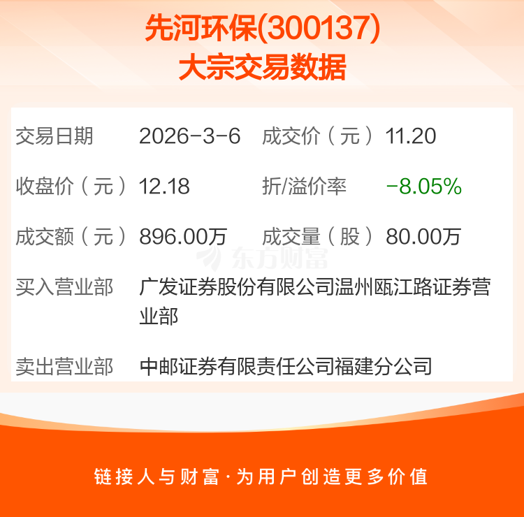 2026年3月6日,先河环保发生1笔大宗交易,共成交80.00万股,成交金额896.00万元,占其流通市值比例为0.14%。